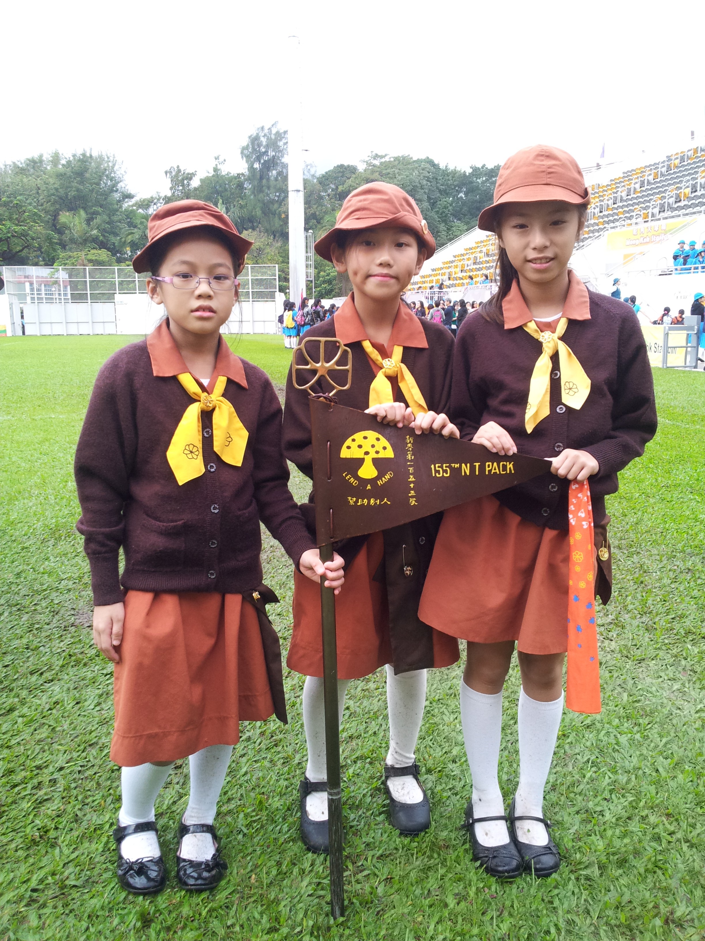 小隊員謝愷茵、陳海澄及陳倩韻,代表我們新界第155小女童軍隊擔當旗隊,參與大會操儀式,妳們都表現得表常好呢,坐在觀眾席上的其他小隊員都為妳們打氣!
