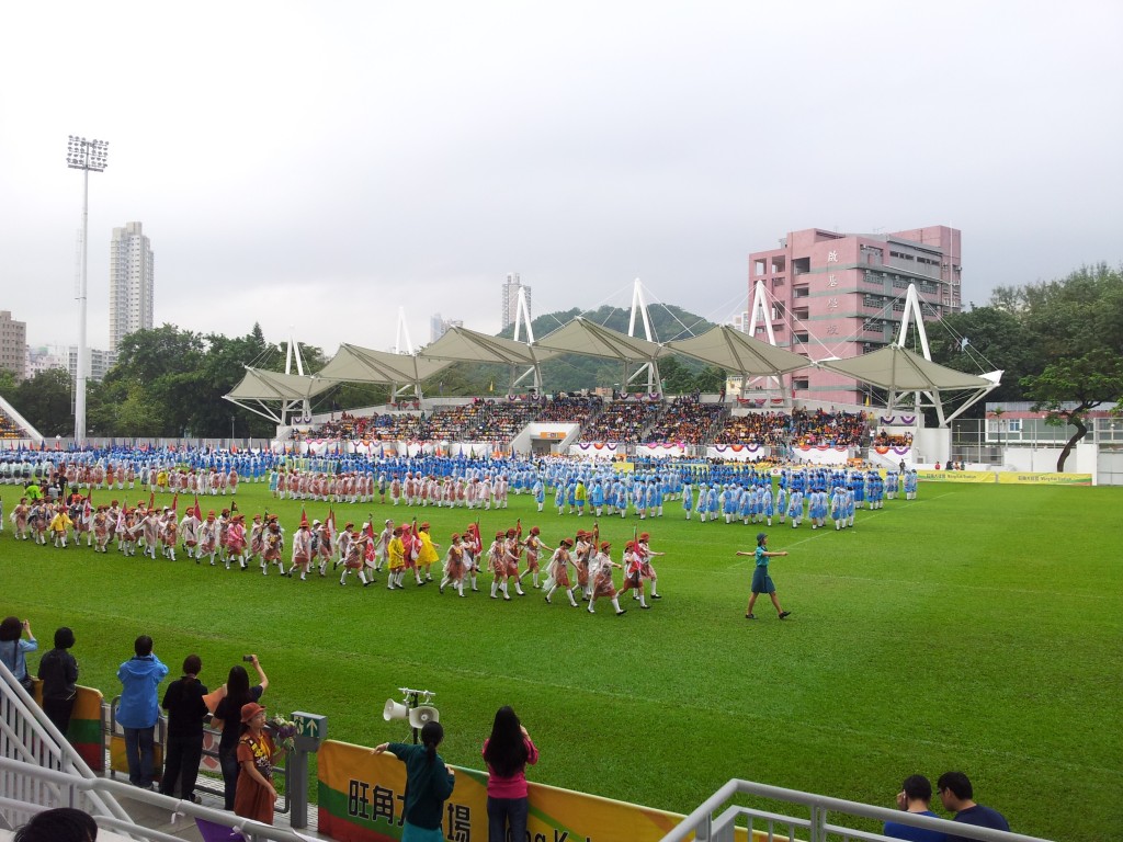 參與大會操的隊伍來自港九新界,人數眾多,在球場上步操非常壯觀,你能找到我們的旗隊嗎?